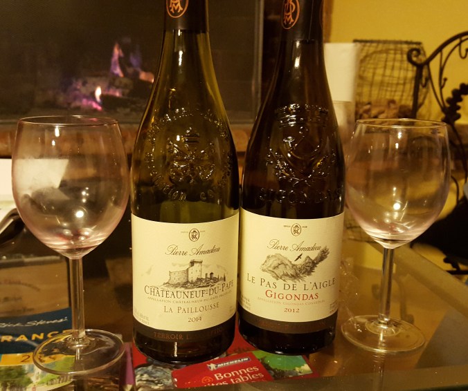We set the coffee table in front of the fireplace to enjoy our last dinner (at least, for this trip) in our Sablet house, a dinner that I will remember for much more than the delicious food.