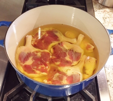 - Put half an inch of fat in the bottom of Dutch oven. Place legs in the bottom of the pot in a single layer.