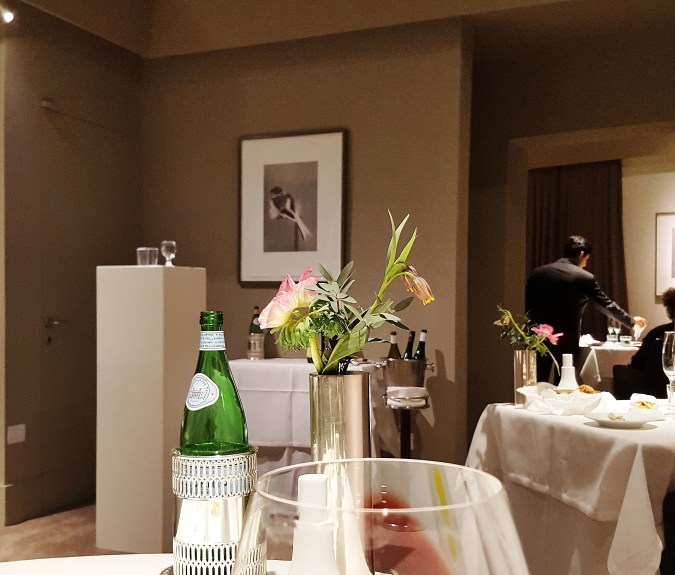 There were only twelve tables which were divided among three dining rooms, so our comfort and personal space was guaranteed. Even so, we spoke in our “library” voices as did everyone else. We did hear bits of French, German and UK English conversations at other tables. (I am probably showing my age, but I find subdued ambiance much more pleasant than many San Francisco or Los Angeles hot-spots where noise prevents normal conversation with my dining partner.)