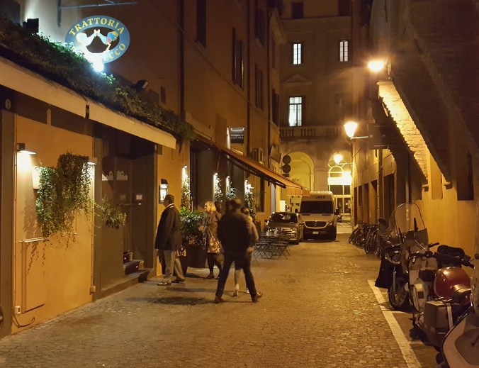 After another interminable wait (still aboard), the pilot assured us that we would fly back to Bologna as soon as a gate was secured and British Air had newly approved flight plans. In the meantime, everyone on the airplane was getting hungry and grouchy, or as the Brits say, “a bit bothered.” Luckily, Karel (ever prepared) had a bag of dried California apricots which she shared with all of our surrounding (new) friends. We got to know everyone around us – an Italian group returning from a swing dance competition, a couple from England celebrating the husband’s 70th birthday, and two delightful young Italian women who spoke perfect English and volunteered to call our B&B and Trattoria Battibecco to let them know about our plight. They convinced the manager of the B&B (who would normally be at home by now) to stick around until we arrived. The restaurant agreed to seat us up until 10:00 but could not wait longer because the cooks and waiters had been working all day with no break because of the snow.