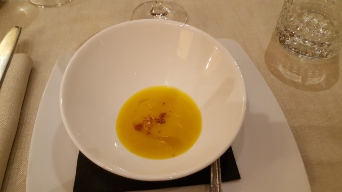 We were soon served an Amuse Bouche – a brothy potato soup. It was warm and satisfying for the cold evening.