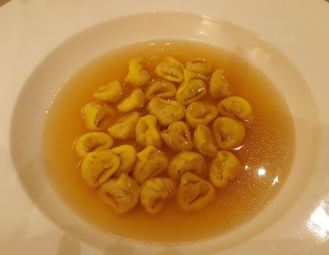 For our Primi Piatti, I had to order the utterly classic tortellini in brodo. The tortellini were stuffed with meat and served in a golden broth made from capon (with some beef in the broth as well). In Bologna, you can find tortellini served in a creamy sauce—but, trust me, the broth route is supreme. I have eaten this spectacular specialty in several places but this one was unquestionably the best in my experience – rich broth, nutmeg-spiked tortellini, the resilient chew of a lifetime!
