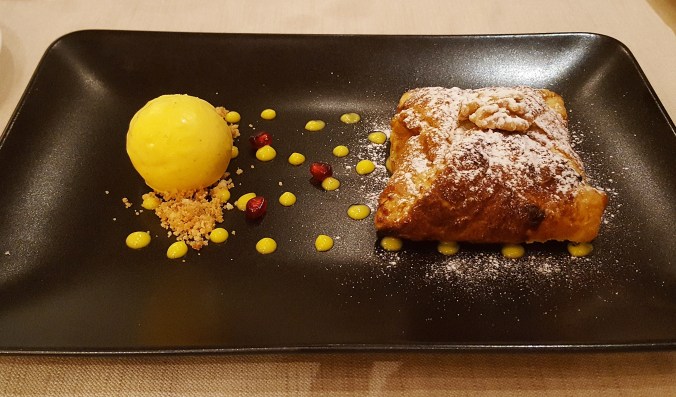 After a huge meal like this, we didn’t want (or need) a heavy dessert. Still, we couldn’t just walk away. We settled on sharing a nice warm puff pastry filled with spiced apples and some vanilla ice cream. It was comforting and delicious.
