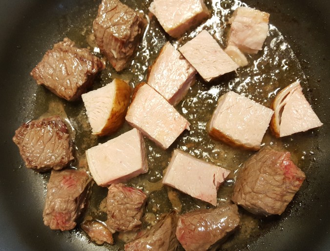 - Season the meat with salt and pepper. Melt the lard in a large cast iron skillet and brown all of the meat. Remove meat, coarsely chop and add to the stew pot.